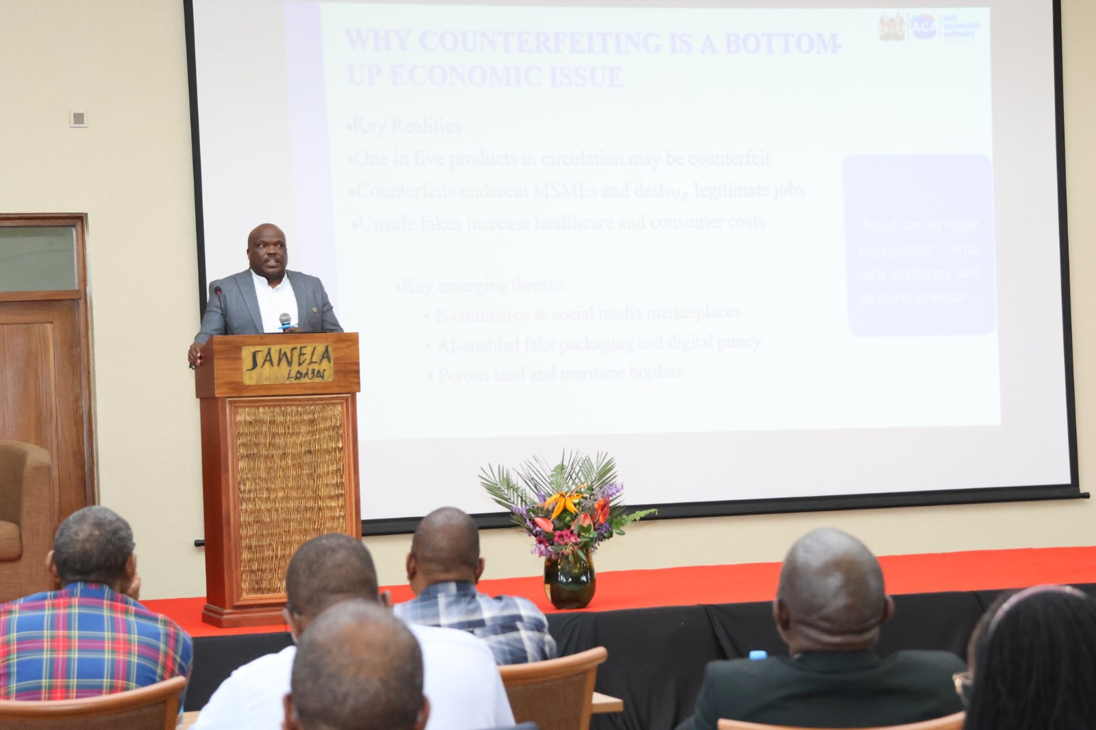 Also in attendance are Nelson Gaichuhie, Board Chairman of the Anti-Counterfeit Authority, and Board Member, Neddy Kiptoo.